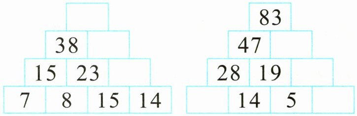 思路分析 先比較最底層和倒數(shù)第二層的數(shù),再比較倒數(shù)第二層和倒數(shù)第三層的數(shù),可以發(fā)現(xiàn)規(guī)律:下面相鄰兩個(gè)數(shù)的和就是這兩個(gè)數(shù)上面的一個(gè)數(shù)。由此推算出第一題空格里的數(shù)自下而上分別是 $15 + 14 = 29$,$23 + 29 = 52$,$38 + 52 = 90$。第二題空格里的數(shù)自上而下分別是 $83 - 47 = 36$,$36 - 19 = 17$,$28 - 14 = 14$,$17 - 5 = 12$。