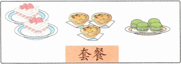 跟蹤練習 2 亮點原創(chuàng)·蛋糕店今天還剩下 15 塊蛋糕、19 個蛋撻和 23 枚馬卡龍,將這些糕點組成套餐售賣(如下圖),最多可以組成幾份?