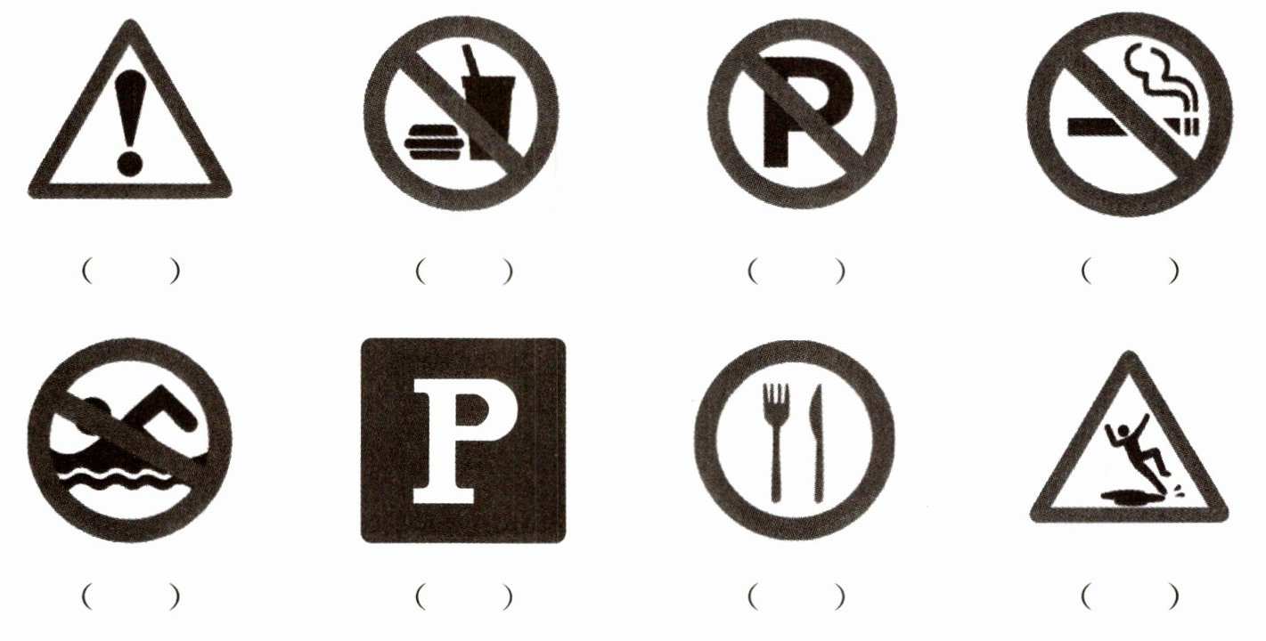 答案:1. can't park 2. swim 3. Wet floor 4. No littering