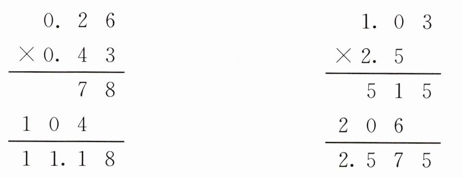 $\end{array}\\$ $$\begin{array}{r}$1.\ 0\ 3 \\×\ 2.\ 5 \\$\hline$5\ 1\ 5 \\2\ 0\ 6 \\$\hline$2.\ 5\ 7\ 5 \\$\end{array}\\
