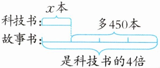 (2) 設(shè)科技書有 $ x $ 本,故事書是科技書的 4 倍,則故事書有 $ 4x $ 本。故事書比科技書多 450 本,可列方程:$ 4x - x = 450 $