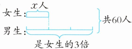 答案:(1) 設(shè)女生有 $ x $ 人,男生人數(shù)是女生的 3 倍,則男生有 $ 3x $ 人。根據(jù)男女生共 60 人,可列方程:$ x + 3x = 60 $