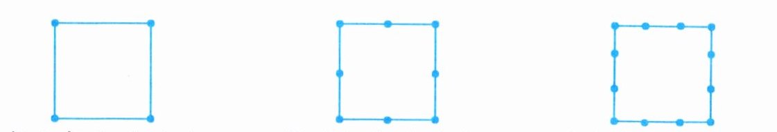 第一個圖,每邊點數(shù):2,總點數(shù):4(直接數(shù)得);第二個圖,每邊點數(shù):3,總點數(shù):3×4 - 4 = 8(每邊3個點,4邊共12個,減去4個重復頂點);第三個圖,每邊點數(shù):4,總點數(shù):4×4 - 4 = 12(每邊4個點,4邊共16個,減去4個重復頂點)。