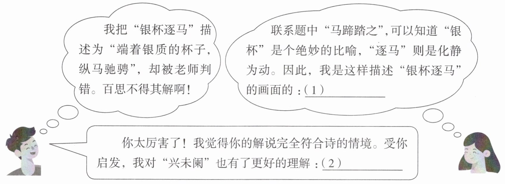 我把“銀杯逐馬”描述為“端著銀質(zhì)的杯子,縱馬馳騁”,卻被老師判錯(cuò)。百思不得其解?。?br>聯(lián)系題中“馬蹄踏之”,可以知道“銀杯”是個(gè)絕妙的比喻,“逐馬”則是化靜為動(dòng)。因此,我是這樣描述“銀杯逐馬”的畫面的:(1)