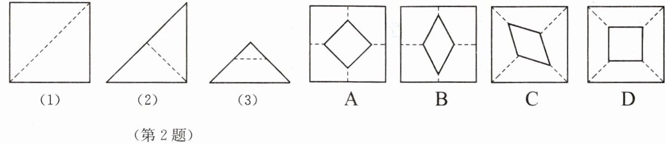 2. 如圖,小強(qiáng)拿了張正方形的紙[圖(1)],沿虛線對折一次得圖(2),再對折一次得圖(3),然后用剪刀沿圖(3)中的虛線(虛線與底邊平行)剪去一個角,再打開后的形狀應(yīng)是(