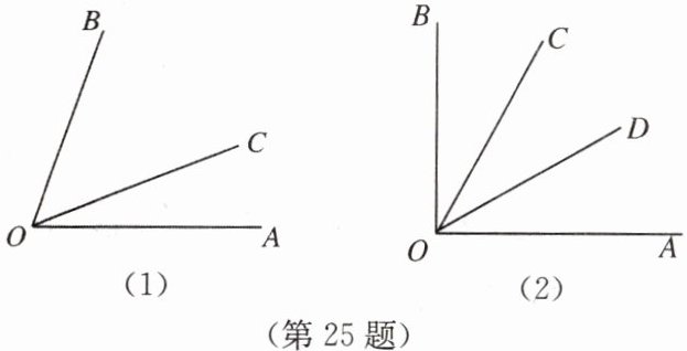 (1)如圖(1),已知 OC 是∠AOB 的一條三分線,且∠BOC > ∠AOC,若∠AOB = $75^{\circ}$,則∠AOC =