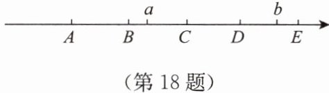 18. 如圖,A,B,C,D,E 分別是數(shù)軸上五個連續(xù)整數(shù)所對應(yīng)的點,其中有一點是原點,數(shù) a 對應(yīng)的點在 B 與 C 之間,數(shù) b 對應(yīng)的點在 D 與 E 之間,若$|a| + |b| = 3$,則原點可能是______
