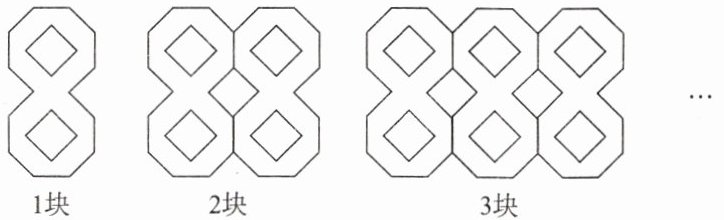 問題 如圖,用“8字磚”鋪設(shè)地面,1塊地磚有2個正方形,2塊地磚拼得5個正方形,3塊地磚拼得8個正方形……照此規(guī)律拼下去。