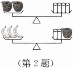 2. 在中央電視臺(tái)“開心辭典”節(jié)目中,某期的一道題目是:如圖,兩個(gè)天平都平衡,則1個(gè)蘋果的重量是1個(gè)香蕉重量的(