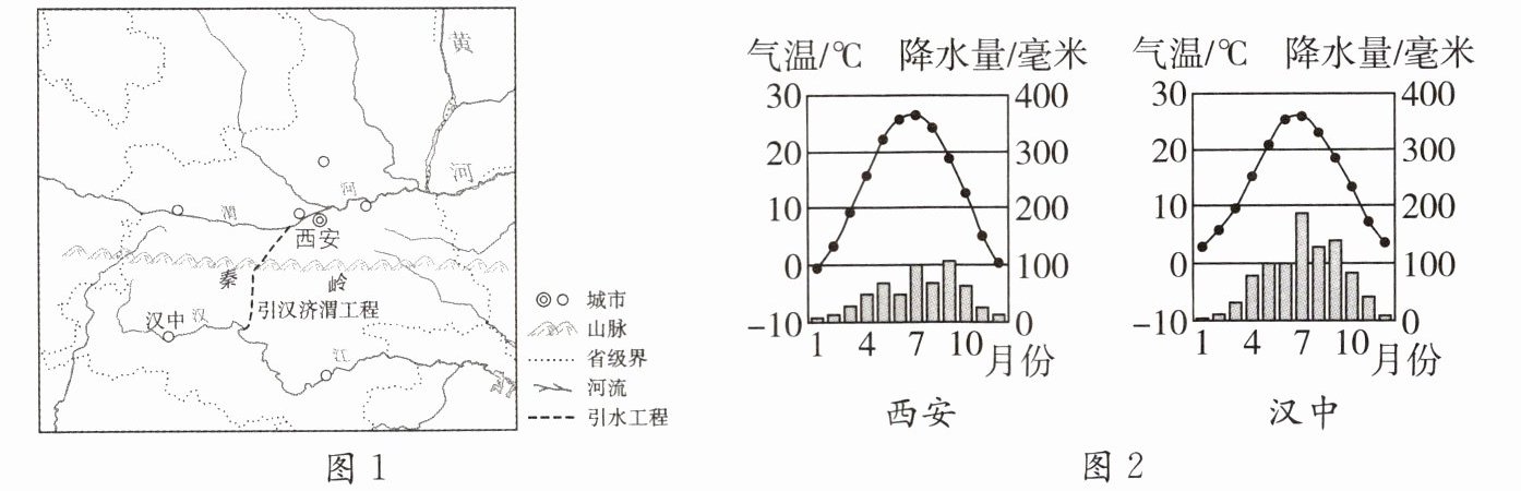 “引漢濟渭”工程被稱作小南水北調工程,采用隧洞引水方式,將漢江水引入渭河。建成后,能有效緩解渭河流域水資源短缺狀況,每年為1411萬人提供15億立方米的生產生活用水,可有效回補過度開采的地下水,對遏制渭河生態(tài)環(huán)境惡化發(fā)揮重大作用。秦嶺生物種類非常豐富,被稱為世界罕見的“生物基因庫”。圖1為“引漢濟渭”工程示意圖,圖2為西安、漢中氣溫曲線與降水量柱狀圖。
