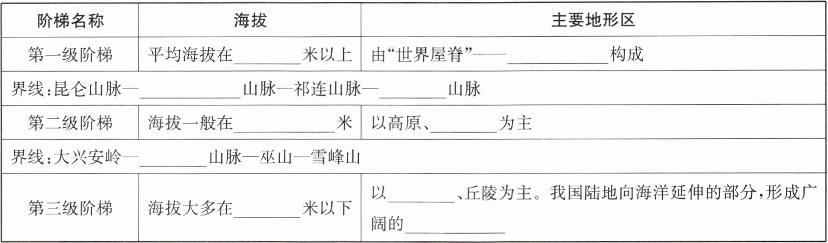 答案:1.(從左到右,從上到下)4 000 青藏高原 阿爾金 橫斷 1 000~2 000 盆地 太行 500 平原 大陸架 2.