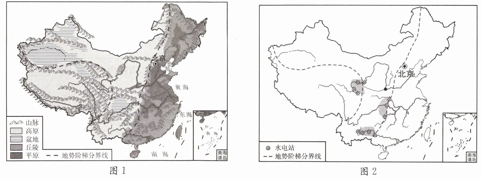 圖1為中國(guó)地形分布示意圖,圖2為中國(guó)地勢(shì)階梯及部分水電站分布圖。請(qǐng)你幫助同學(xué)們完成以下探究活動(dòng)。