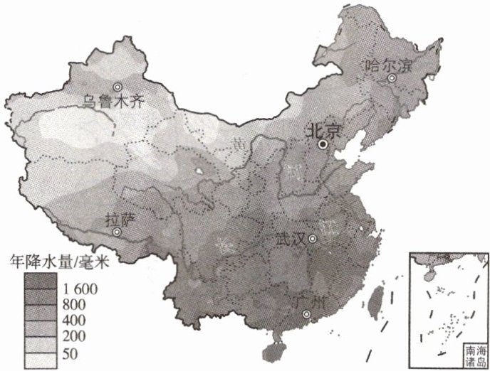 城市,讓生活更美好!在各大城市相繼推出“共享單車”之后,“共享雨傘”也來了。讀中國年降水量分布圖,完成2~4題。