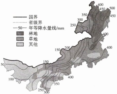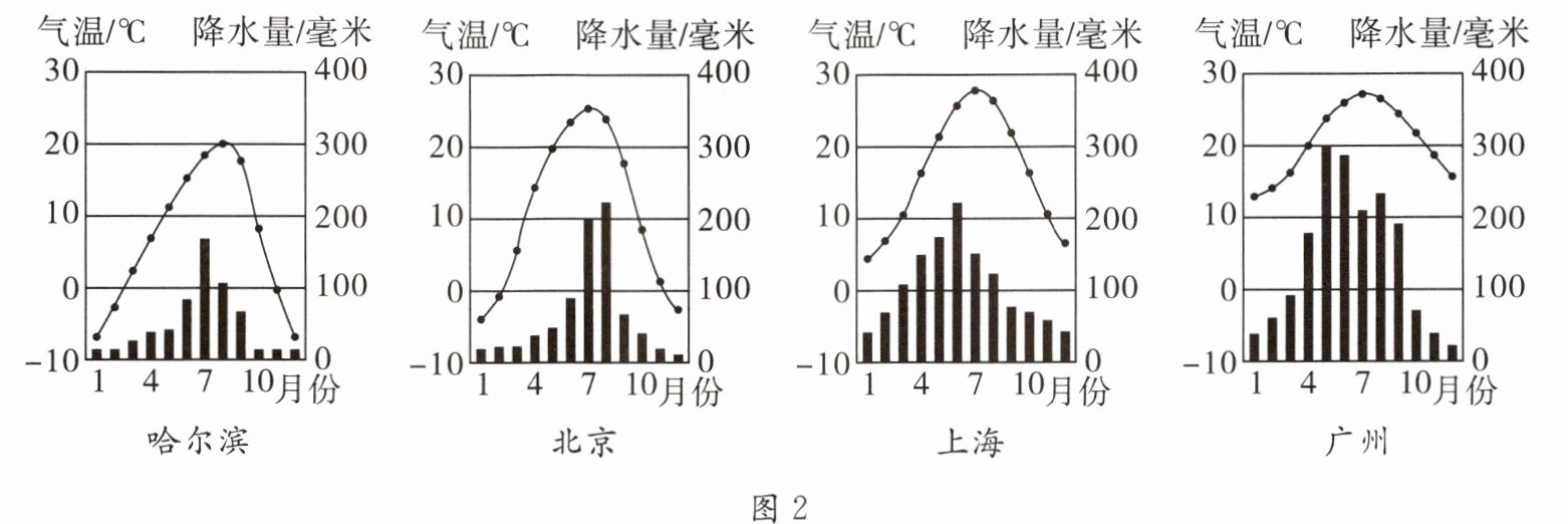 (4)讀圖2中的四地降水,分析我國(guó)東部地區(qū)降水的季節(jié)和空間分布特點(diǎn)。