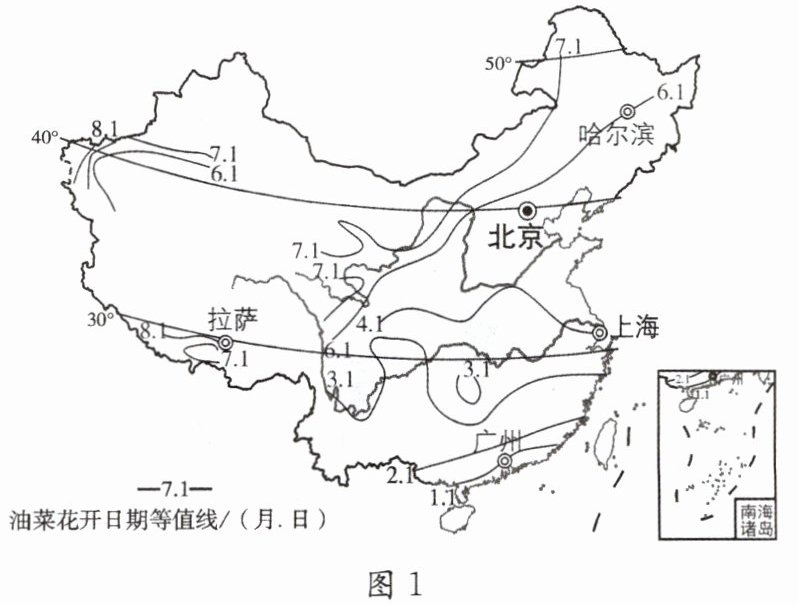(2)圖1中上海和拉薩兩地緯度相近,兩地相比,油菜開(kāi)花日期較晚的是何地?造成兩地油菜開(kāi)花日期不同的主要原因分別是什么?