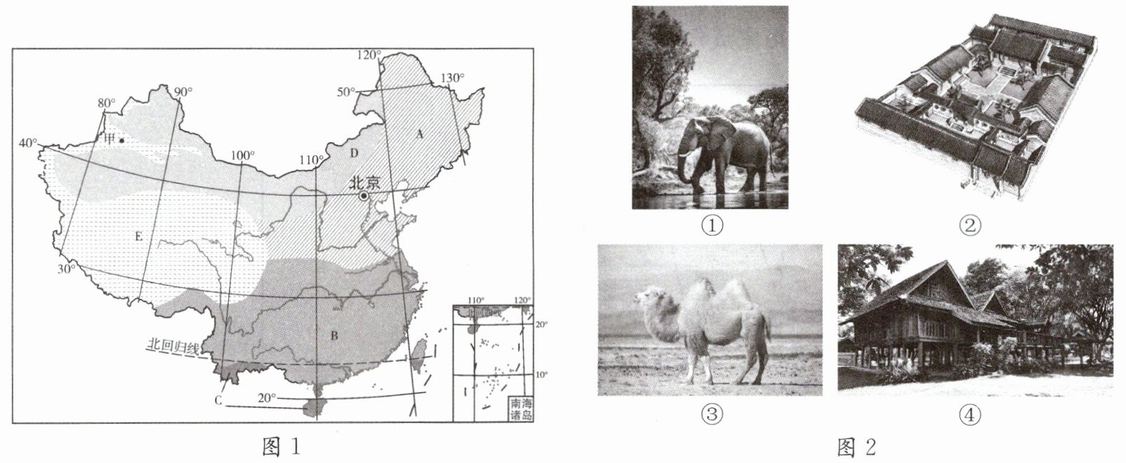 我國地域遼闊,氣候類型多樣,各地區(qū)自然和人文地理特征差異顯著。圖1為我國氣候類型分布示意圖,圖2為不同區(qū)域的景觀照片。