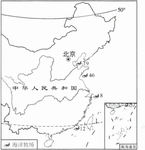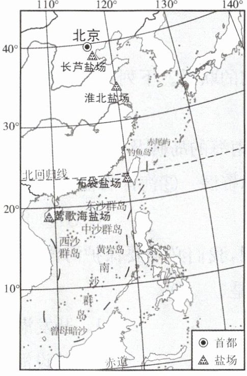 6. 海鹽是海洋對(duì)人類的饋贈(zèng),主要是在鹽田通過日曬海水獲得。鹽場(chǎng)一般建在氣溫高、日照強(qiáng)、降水少、蒸發(fā)量大的沿海灘涂地區(qū)。下圖為我國(guó)部分地區(qū)鹽場(chǎng)分布圖。據(jù)此完成8~9題。