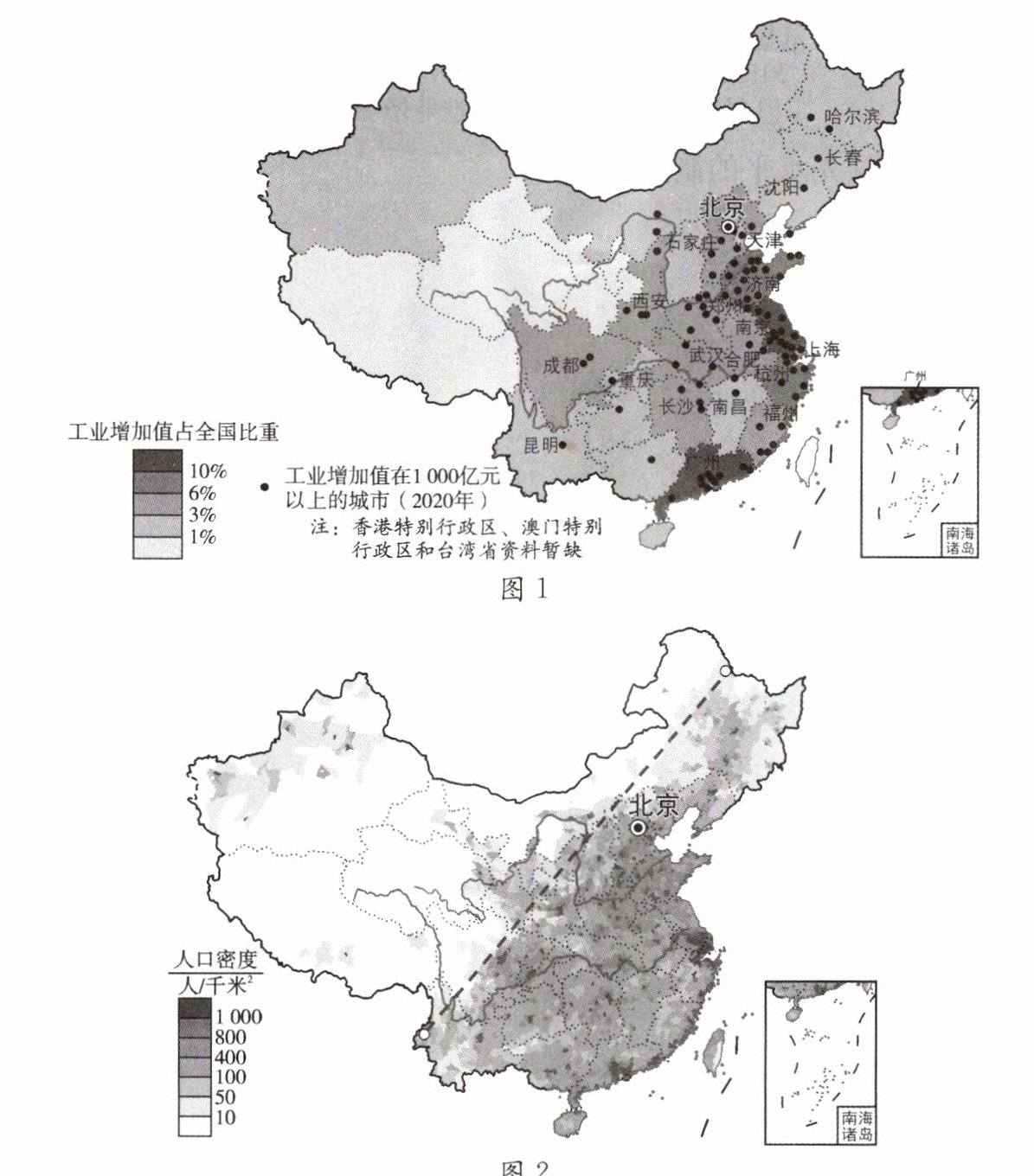 一個(gè)城市的工業(yè)增加值大致反映該城市的工業(yè)發(fā)展水平,圖1為中國(guó)各省級(jí)行政區(qū)工業(yè)增加值的全國(guó)占比及主要工業(yè)城市分布圖,圖2為中國(guó)的人口分布圖。