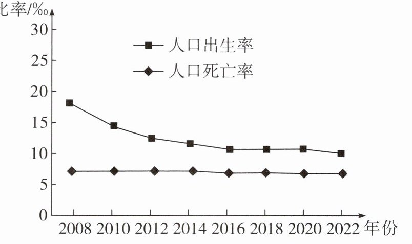 材料三:右圖示意某省某段時期人口出生率和死亡率的變化。(人口自然增長率=人口出生率-人口死亡率)
