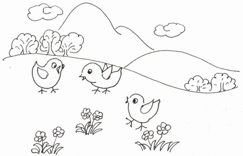 圖中展示了三只雞、幾朵花、幾座山和一棵樹(可視為遠(yuǎn)處樹木群體中的一棵),根據(jù)題目要求,需在圖中景物對應(yīng)的名稱后打“√”。“一只鴨”圖中沒有,“一匹馬”圖中也沒有。所以“三只雞”“幾朵花”“幾座山”以及代表“一棵樹”的樹木圖案對應(yīng)的選項(xiàng)應(yīng)打“√”。