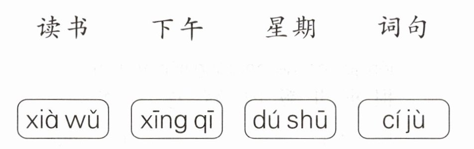本題要求將漢字與對應(yīng)的拼音相連,也就是把上排漢字和下排對應(yīng)的拼音匹配連接?!白x書”對應(yīng)“dú shū” ;“下午”對應(yīng)“xià wǔ”;“星期”對應(yīng)“xīng qī”;“詞句”對應(yīng)“cí jù”。