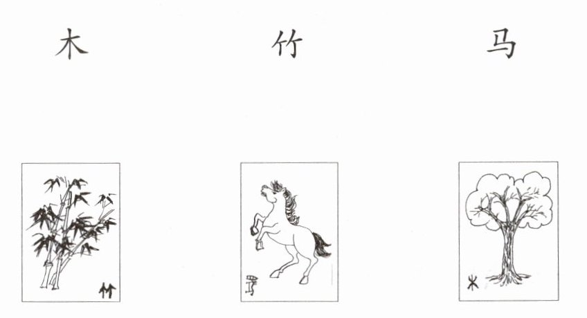 答案:木-第三幅圖,竹-第一幅圖,馬-第二幅圖