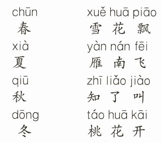 答案:春——桃花開;夏——知了叫;秋——雁南飛;冬——雪花飄;藍藍的——天空;彎彎的——月牙;清清的——河水;圓圓的——蓮葉 。 (以連線對應關系呈現(xiàn),按題目要求無需填選項,此為內容對應答案形式)