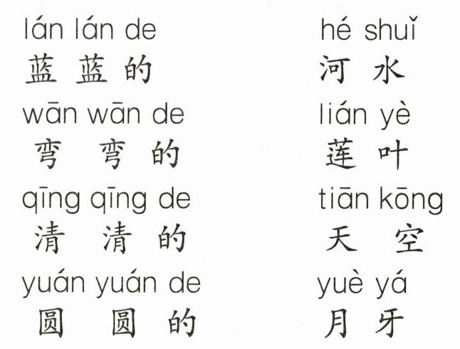 冬天會下雪,雪花飄落,所以“冬”與“雪花飄”相連;月牙的形狀是彎彎的,所以“彎彎的”與“月牙”相連。